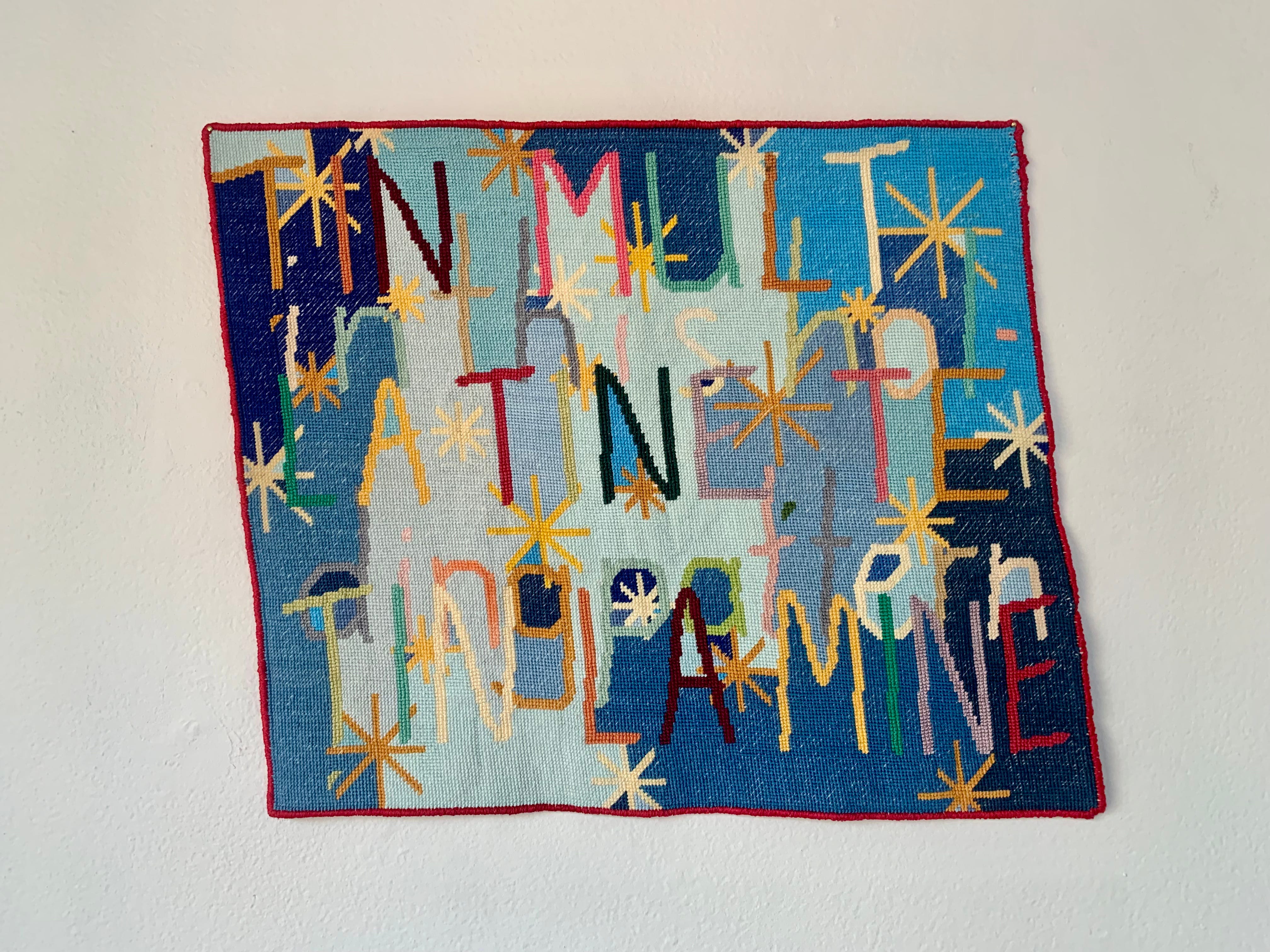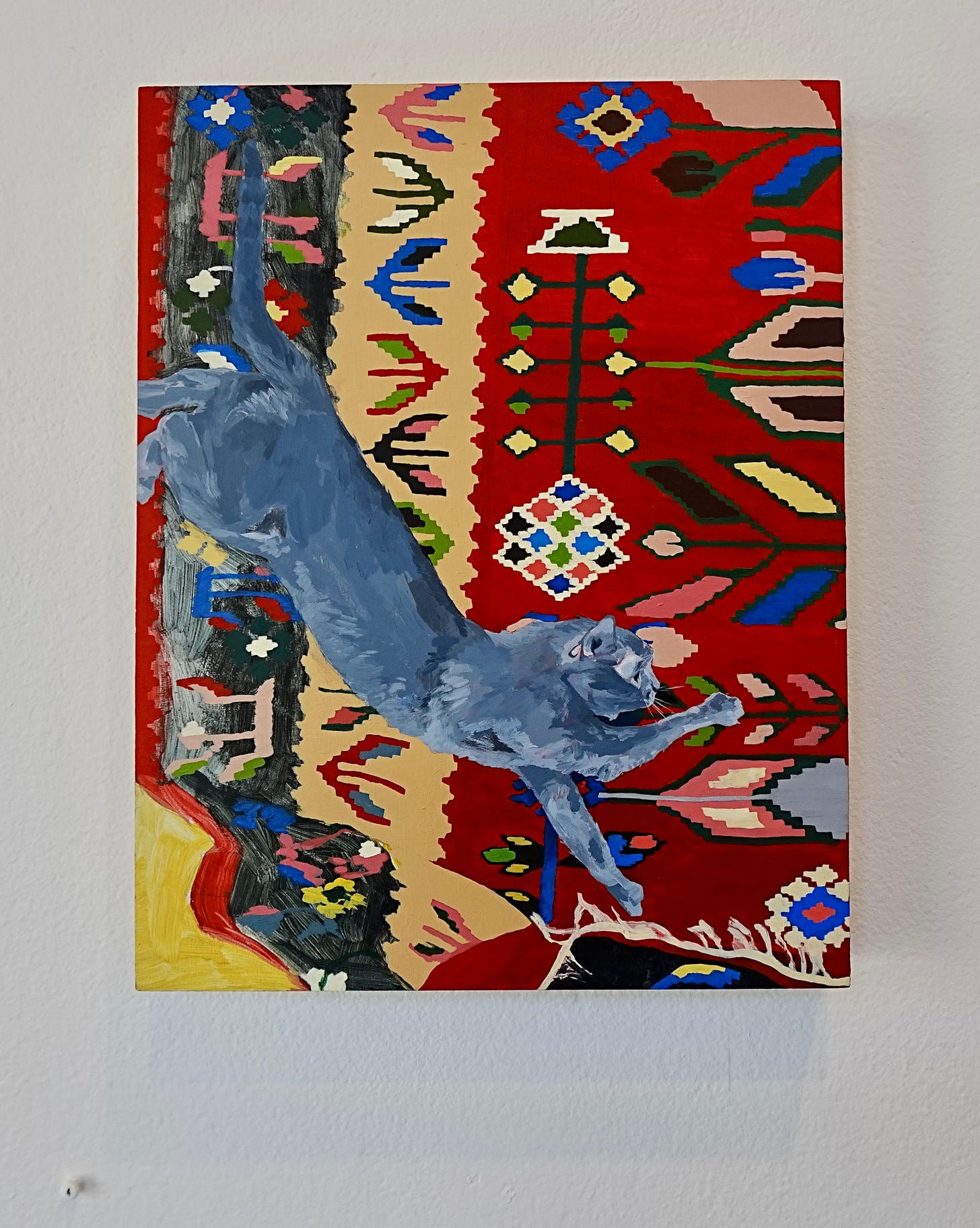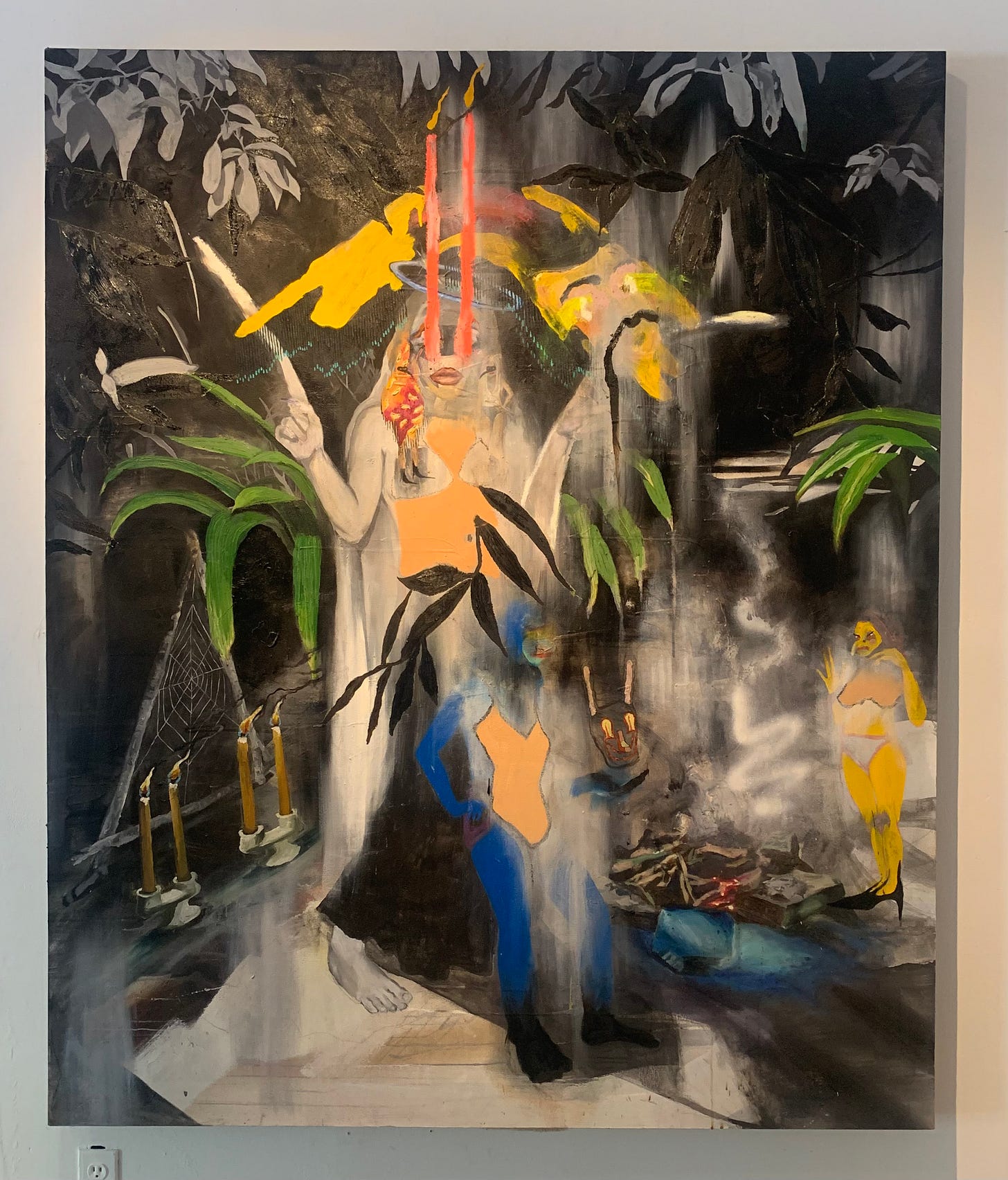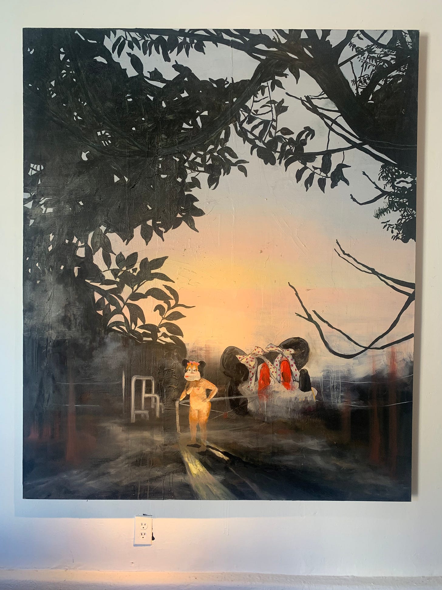 I’m looking at the above image, a photograph of a painting at Alone Time gallery. I’m poking around the image zoomwise trying to access something that was right in front of me when I was there. I can tell by the texture of my memory that my attention was flimsy in the moment. Now the show—The Magic Power of the Shovel, New Work By Margot Couture + Libbie Allen.—is closed and the painting is somewhere else.