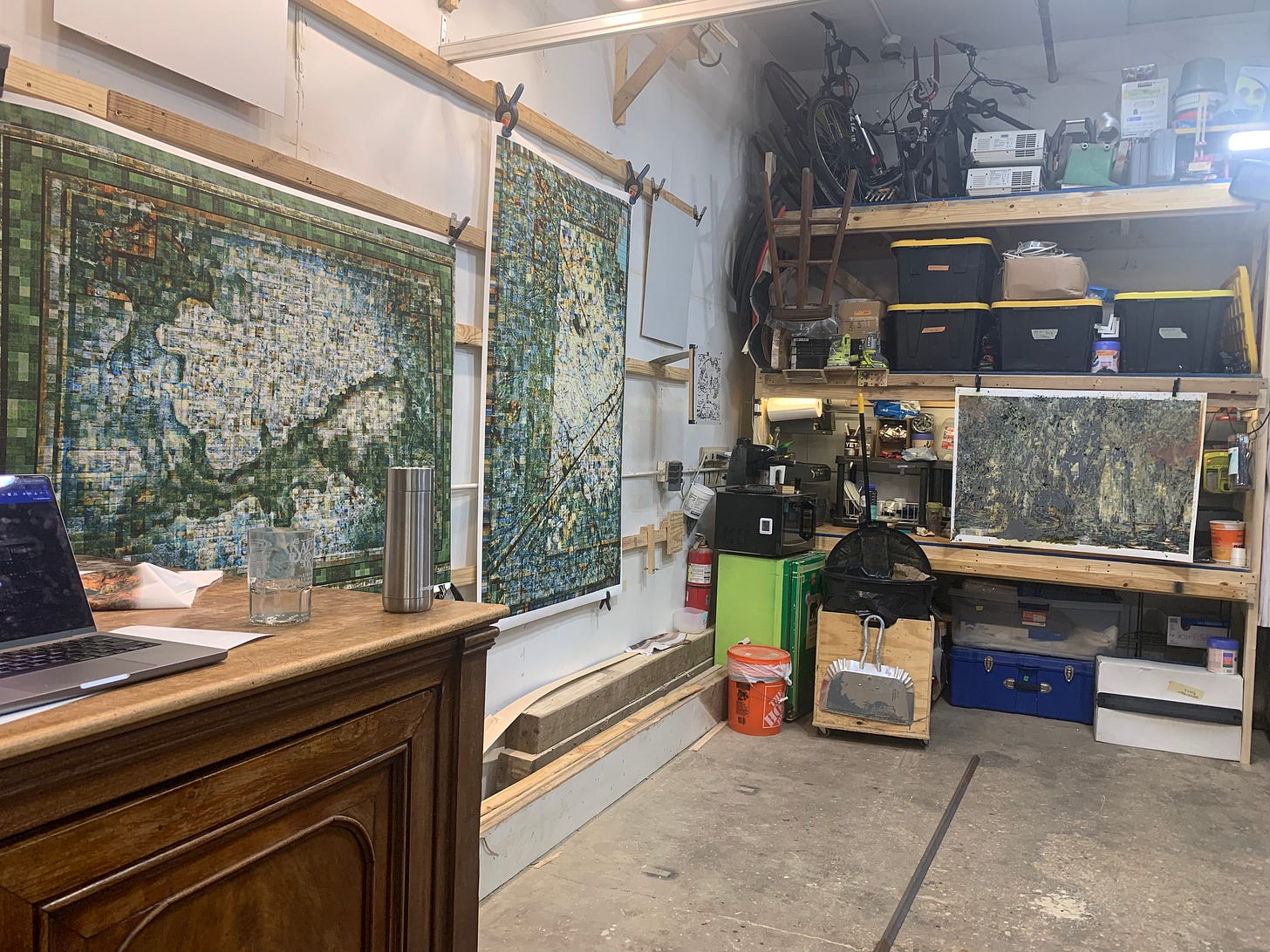 The studio is orderly but densely packed. Large 2-D works hang along the wall. HIs work is tirelessly curious, intrepid, and yeah, nerdy.